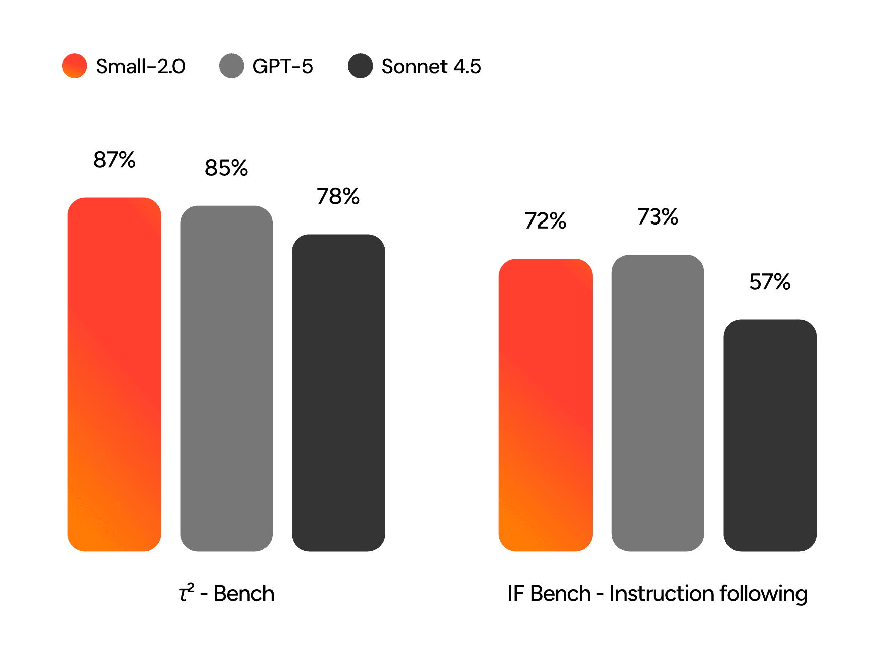 Incredible Small 2.0 ranks superior to traditional LLMs on multi step function calls as depicted in our TAU bench results and stands pretty close to GPT-5 on the scale of following instructions.
